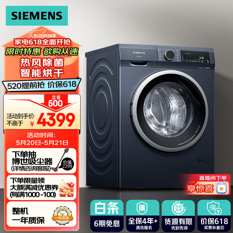 西门子(SIEMENS)10公斤滚筒洗衣机全自动 除菌洗烘一体机 智能烘干 热风清新 均匀烘干 湖蕴蓝 X14W价格:4899.00元!