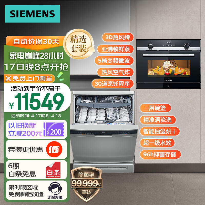 西门子洗嵌套装 16套大容量家用洗碗机 智能抽湿烘干+嵌入式微蒸烤炸四合一套装 SJ23HI+CP565价格:11599.00元!