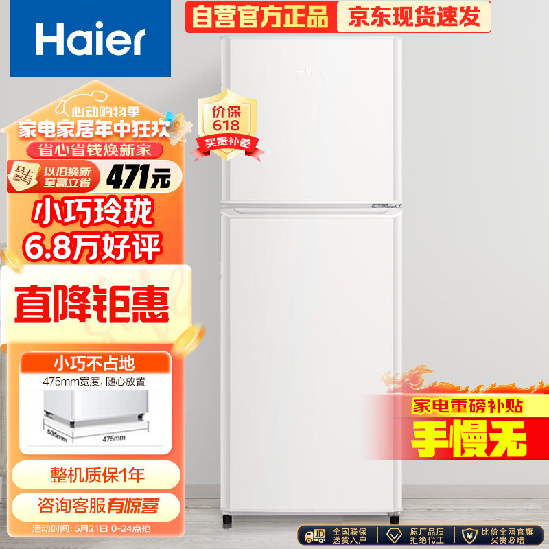 海尔(Haier)137升 两门双开门电冰箱家用小户型迷你宿舍租房办公室节能省电1-2人可用BCD-137TMPF价格:843.00元!
