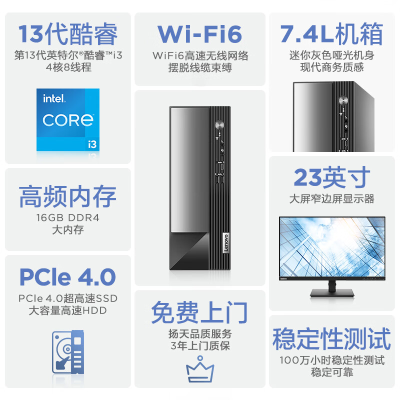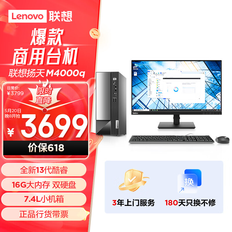 联想(Lenovo)扬天M4000q 商用办公台式电脑主机(酷睿13代i3-13100 16G 1T+512G SSD)23英寸价格:3699.00元!