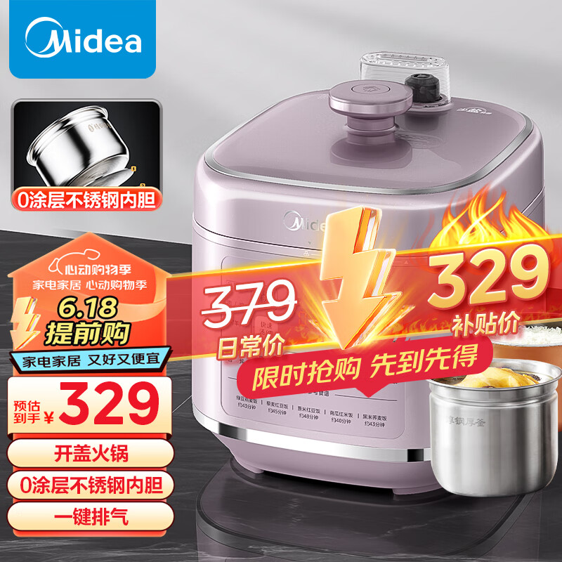 美的(Midea)少盐提鲜炖 深汤 智能电锅5L家用多功能开盖火锅 0涂层钢胆易清洁内胆高压锅C549G(3-6人食)价格:379.00元!