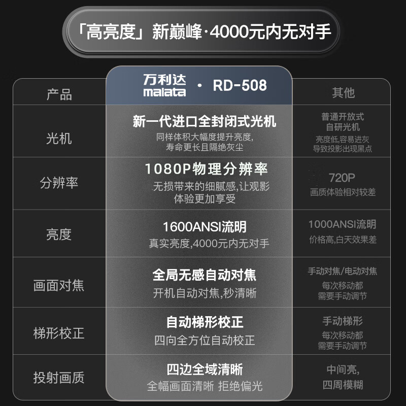 万利达(malata)RD-508 投影仪家用 办公投影机 智能家庭影院电视(全局自动对焦 自动梯形校正 500CVIA)价格:2999.00元!