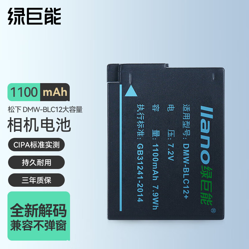 绿巨能(llano)松下DMW-BLC12相机电池 适用G85 G6 G7 GH2 FZ250 FZ200 FZ1000 FZ300相机电池通用价格:119.00元!