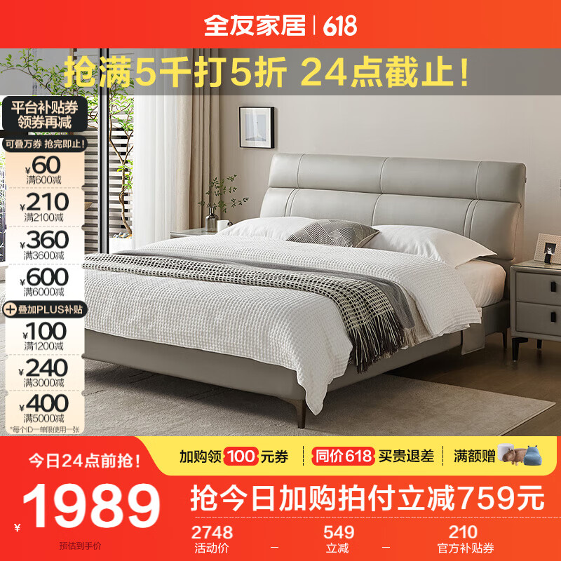 全友家居 真皮艺床 头层牛皮现代简约主卧室双人大床2米2.2米105251价格:2748.75元!