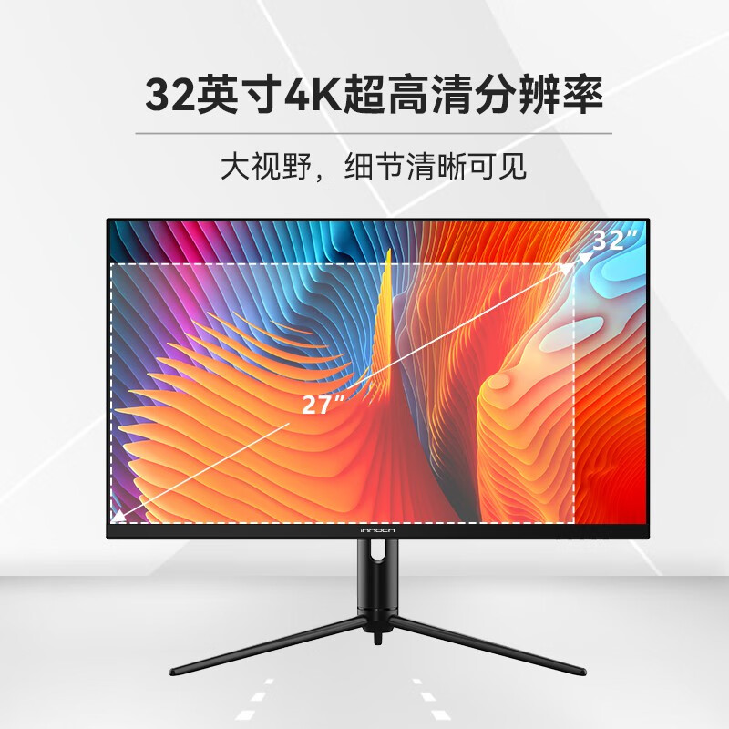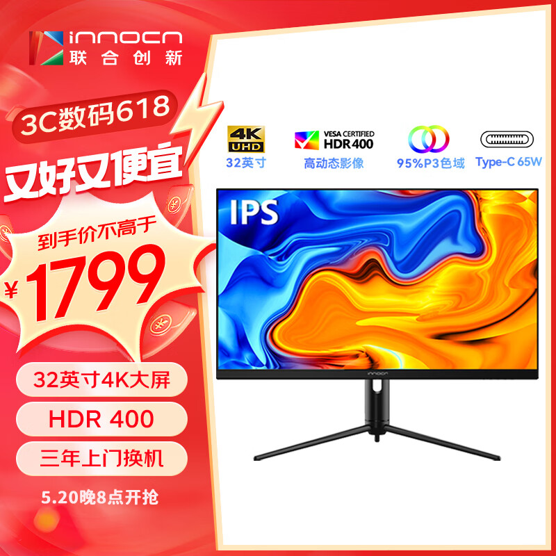 联合创新(INNOCN)32英寸4K显示器IPS广色域Type-C65W HDR400内置音箱 旋转升降 出厂校色 电脑显示屏32C1U价格:1799.00元!
