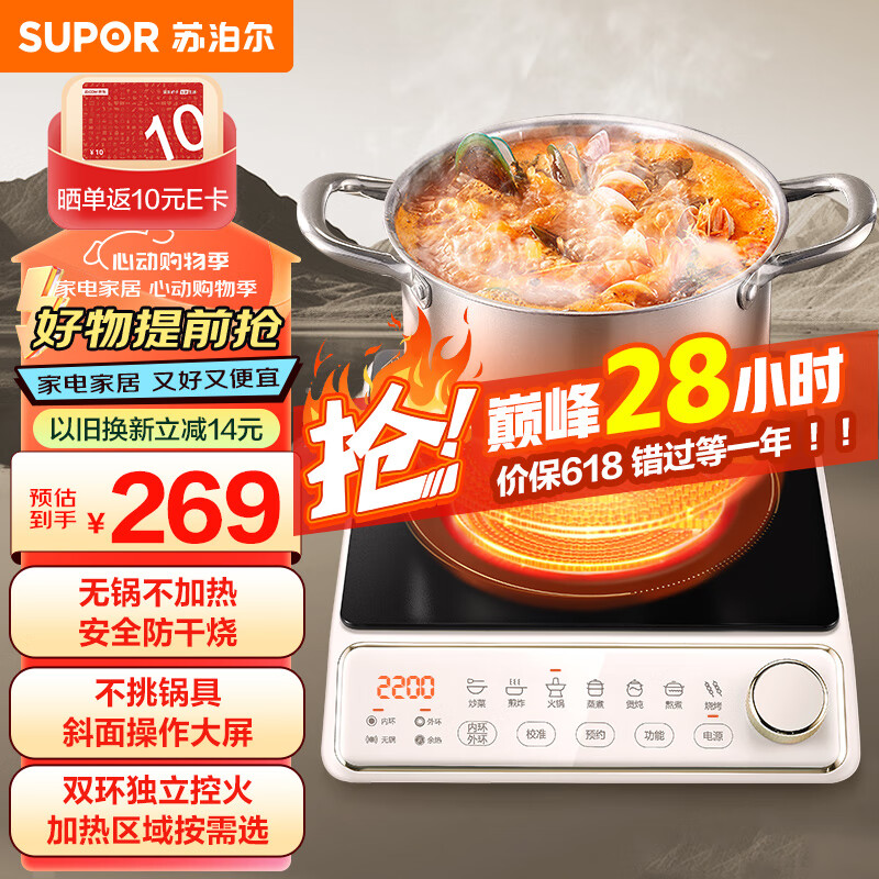 苏泊尔(SUPOR)家用电磁炉 电陶炉 煮茶炉 2200W大功率 智能旋钮 防干烧不挑锅 斜面彩屏多功能围炉煮茶C22-CS51价格:269.00元!