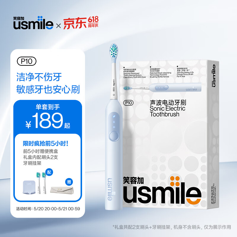 usmile笑容加电动牙刷 成人情侣款礼物送男友/女友 全新缓震清洁刷头 P10鸢尾蓝 520情人节礼物价格:239.00元!