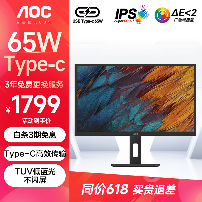 AOC显示器 31.5英寸 2K高清10Bit色彩 IPS技术微边框 Type-C接口 65W反充笔记本 双向旋转升降 Q32P2C价格:1799.00元!