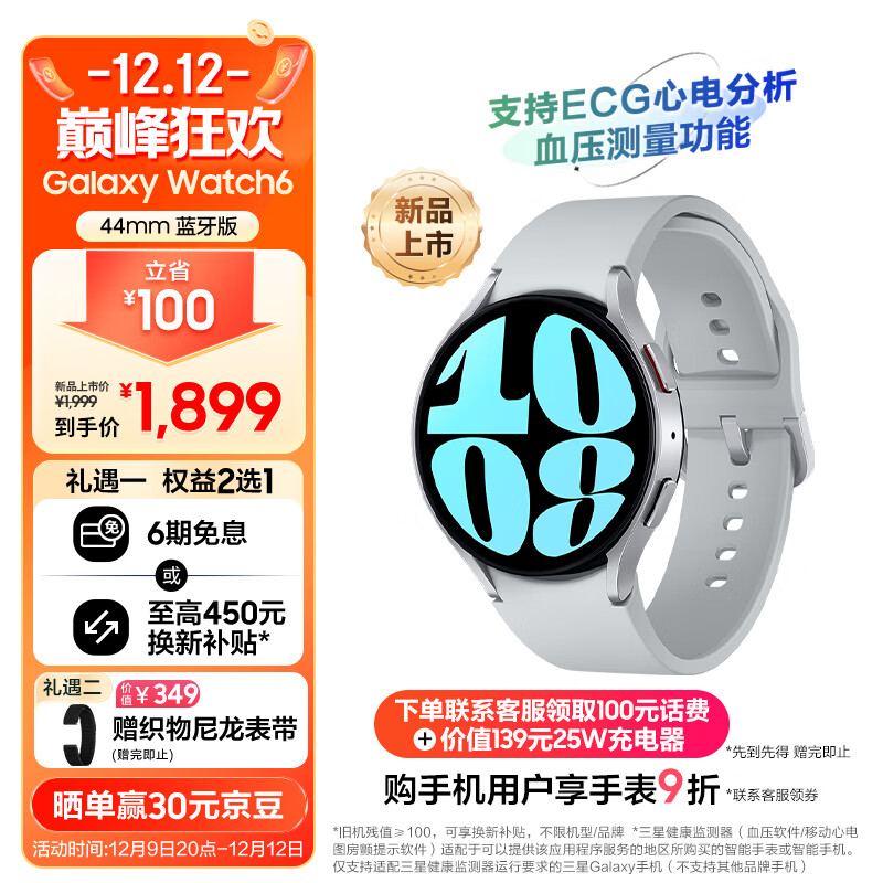 三星Galaxy Watch6 蓝牙通话/智能手表/运动电话手表/ECG心电分析/血压手表/健康监测 44mm 星系银价格:1899.00元!