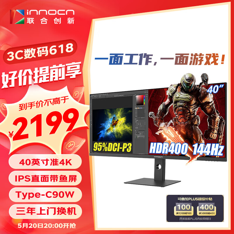 联合创新(INNOCN)40英 带鱼屏 准4K 144Hz显示器IPS HDR Type-C90W旋转升降 电竞游戏电脑显示屏40C1R价格:2599.00元!