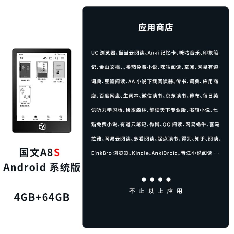 国文 A8S安卓电子书阅读器6英寸高清墨水屏办公小说开放系统护眼微信读书电纸书电子书阅览器4+64G价格:879.00元!