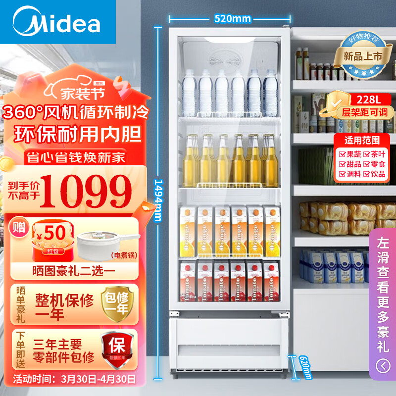 美的(Midea)展示柜 228升大容量超市便利店餐馆酒水啤酒饮料风循环制冷立式玻璃门冰箱商用冰柜SC-228GM(E)价格:1199.00元!