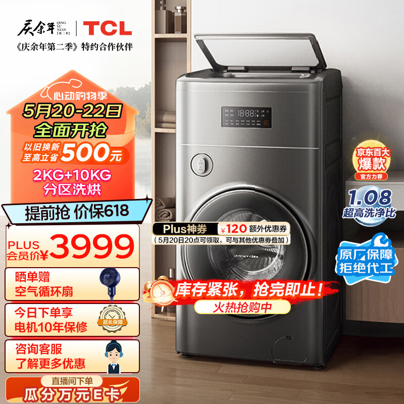TCL 12KG双子舱·复式分区洗烘一体机T300 除菌除螨 直驱变频滚筒洗衣机 APP智控 G120T300-HDY价格:4599.00元!