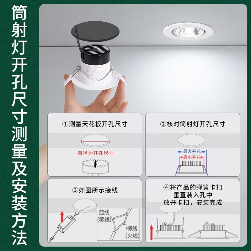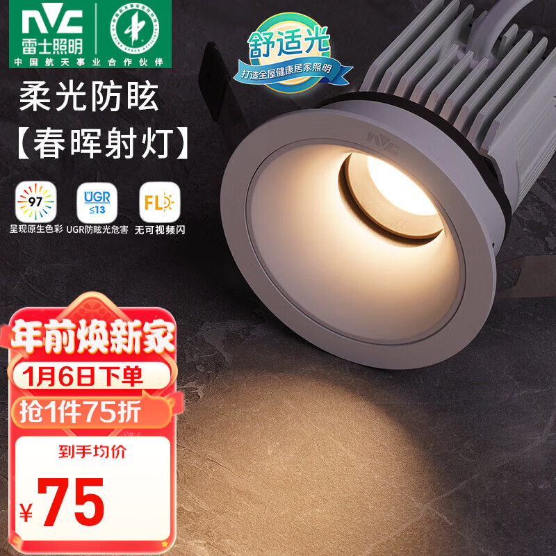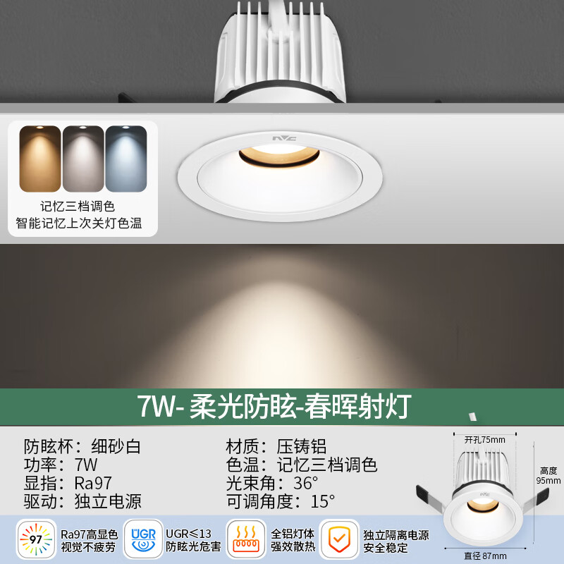 雷士(NVC)LED射灯客厅天花嵌入式筒灯白色7瓦记忆三色开孔75mm【春晖】价格:100.00元!