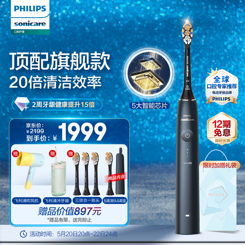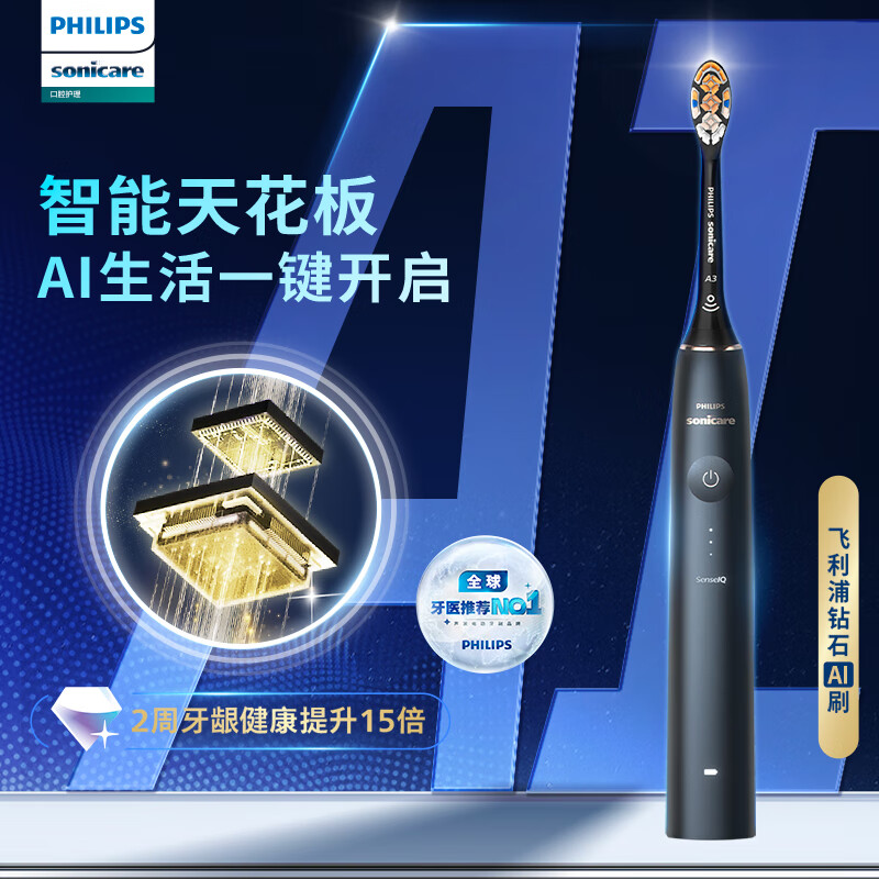 飞利浦(PHILIPS)电动牙刷520情侣送男/女友 含充电旅行盒20倍清除牙菌斑智能感应钻石AI刷旗舰款午夜蓝 HX9996价格:2199.00元!