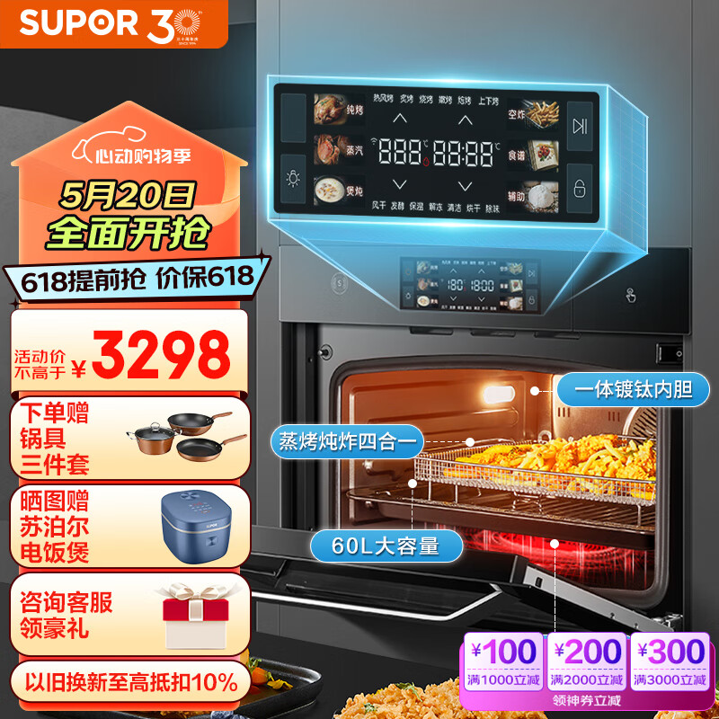 苏泊尔(SUPOR)嵌入式蒸烤箱蒸烤炖炸一体机家用智能多功能自清洁蒸箱烤箱 60L大容量精准控温APP智控 MY88蒸烤价格:3598.00元!