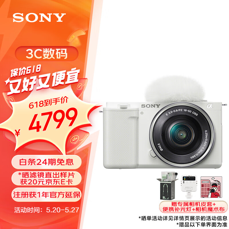 索尼(SONY)ZV-E10L 半画幅微单相机 标准镜头套装 美肤拍照 颜值机身 精准对焦 VLOG APS-C画幅 白色价格:4799.00元!