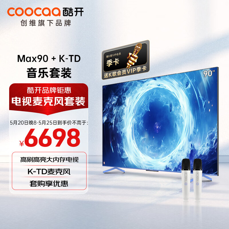 酷开创维 90英寸高刷高亮高分区电视机Max90+K-TD双支麦克风套装 K歌电视 家庭KTV无线话筒唱歌会议价格:7098.00元!