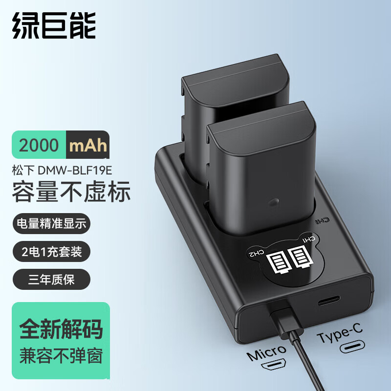 绿巨能(llano)DMW-BLF19E相机电池 适用DMC-GH3 GH5 GH4 DC-G9LGK等充电套装 电池*2充电器*1价格:199.00元!
