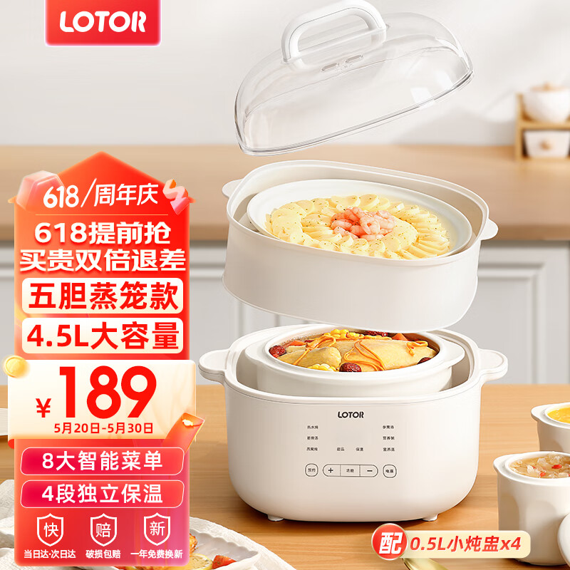 小浣熊电炖锅全自动炖汤锅煲汤煮粥神器隔水燕窝炖盅宝宝小炖锅1-2人陶瓷婴儿辅食锅熬粥专用锅 一锅五胆蒸笼款 4.5L价格:319.00元!