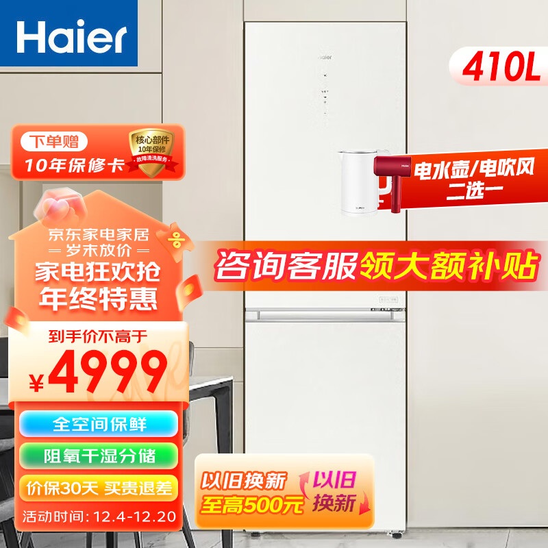 海尔(Haier)410L双开门全空间保鲜零距离自由嵌入式智能WIFI电冰箱 阻氧干湿分储BCD-410WLHC214GXU1价格:4999.00元!
