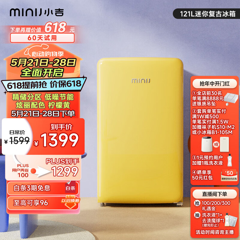 小吉(MINIJ)迷你复古色彩系小冰箱 冷冻冷藏一体 租房宿舍办公室家用节能低噪电冰箱礼物 BC-121CY价格:1499.00元!