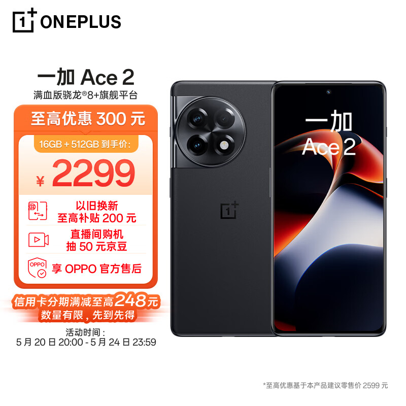 一加 Ace 2 16GB+512GB 浩瀚黑 满血版骁龙8+旗舰平台 1.5K 灵犀触控屏 OPPO AI 5G智能电竞游戏手机价格:2299.00元!