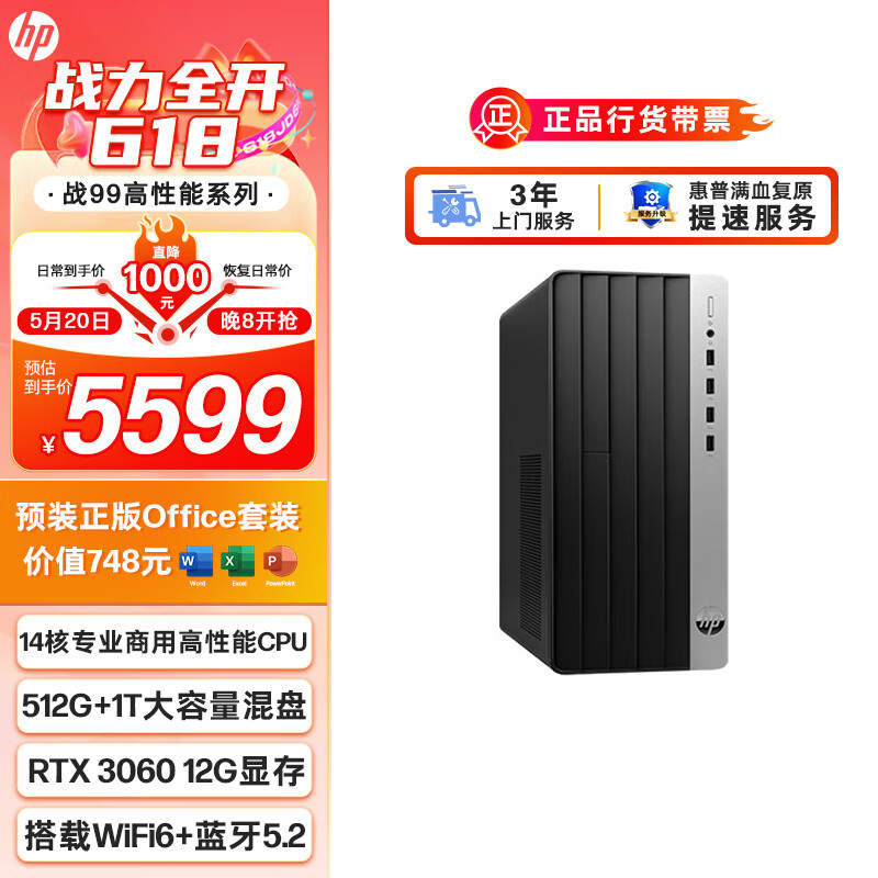 惠普(HP)战99 设计师台式电脑主机(酷睿13代i5-13500 16G 512GSSD+1T RTX3060)14核高性能CPU价格:5599.00元!