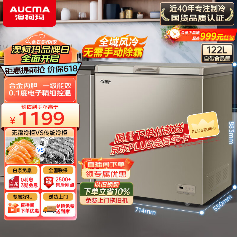 澳柯玛(AUCMA)122升风冷无霜冰柜家用商用单温冷藏柜冷冻柜母乳小冰柜商用小型冷柜冰箱BC/BD-122WD以旧换新价格:1399.00元!