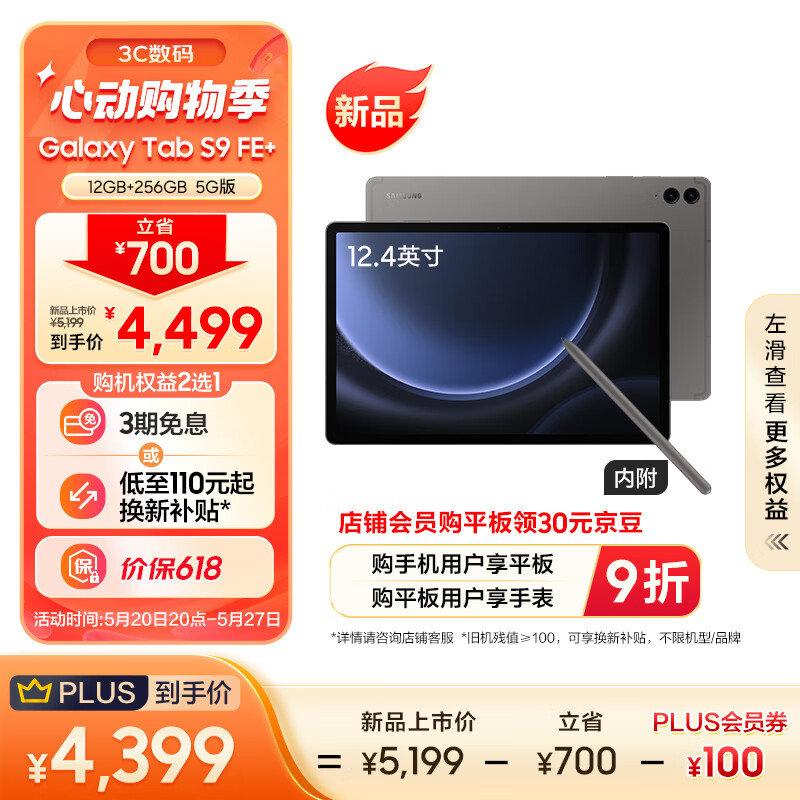 三星(SAMSUNG) S9 FE+ 2023款Tab平板电脑12.4英寸12+256GB 5G版护眼高清大屏IP68防水含Spen石墨灰价格:4499.00元!
