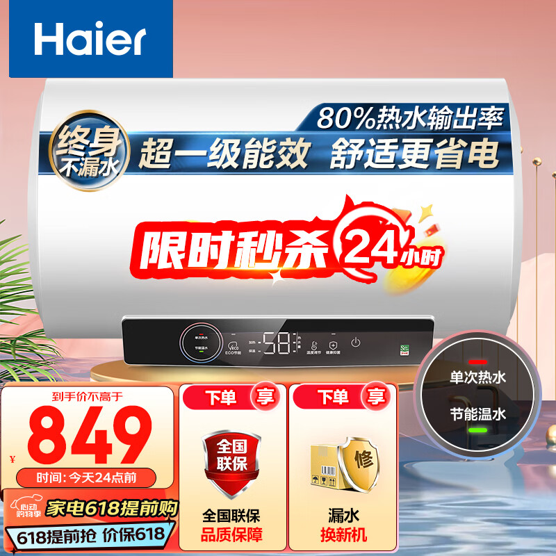 海尔(Haier)60升【安心浴】免换镁棒电热水器家用储水式 2200W节能高效加热抑菌 一级能效长效保温 EC6001-GC3价格:849.00元!