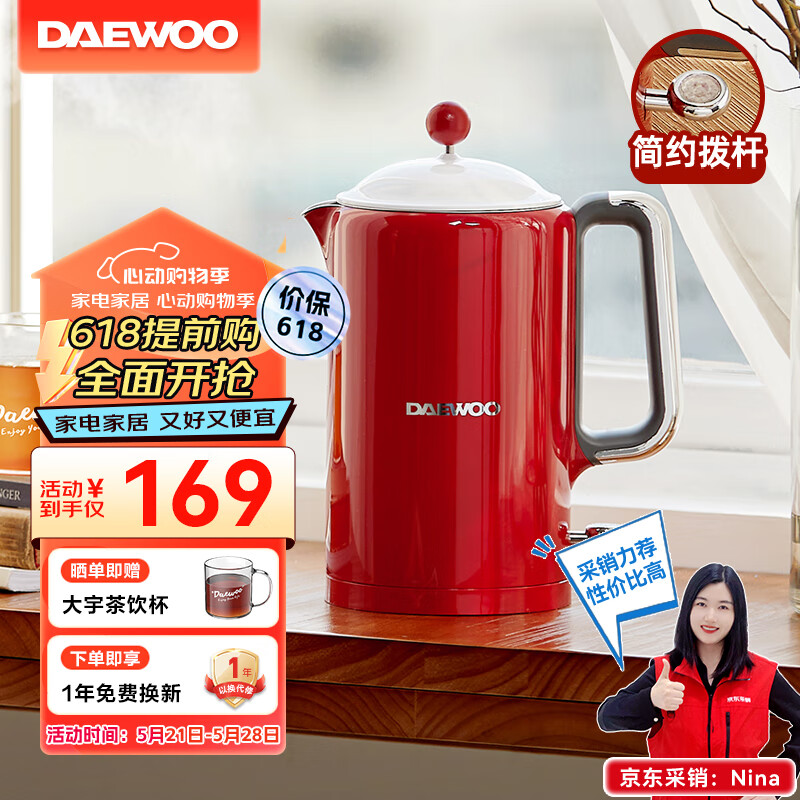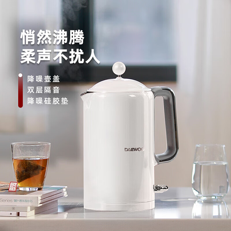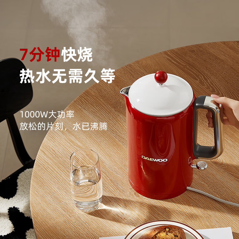 大宇(DAEWOO)复古电热水壶 家用电烧水壶热水壶 双层隔热保温304不锈钢1.5L大容量柔声送礼EK01红色机械款价格:139.00元!