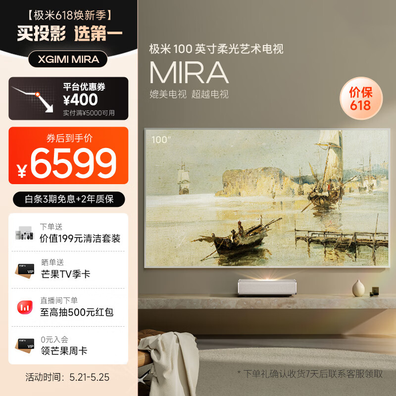 极米100英寸柔光艺术电视MIRA 混合激光超短焦投影( 哈曼卡顿音响 含100吋菲涅尔抗光幕布)包安装价格:6999.00元!