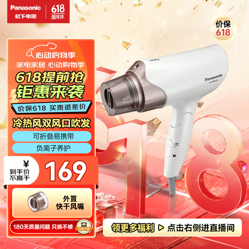 松下(Panasonic)电吹风机大功率高速大风力速干外出家用折叠便携送老婆负离子护发电吹风筒EH-WNE6A价格:169.00元!