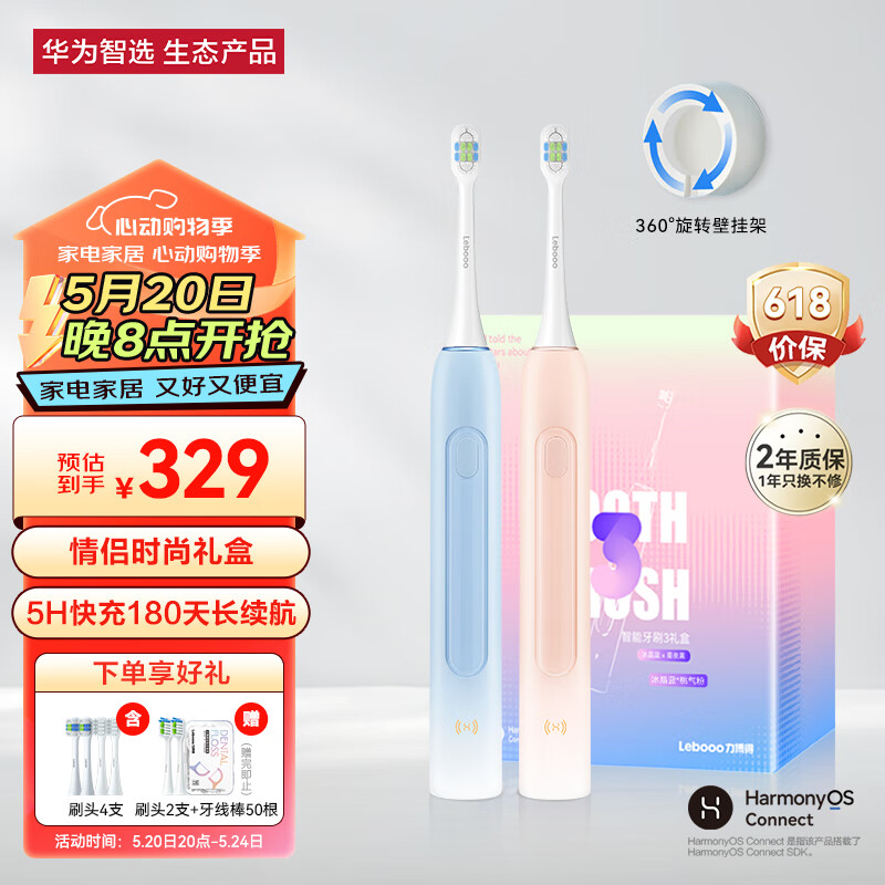 华为智选力博得电动牙刷 送男友送女友礼物 智能声波牙刷清洁亮白180天长续航优漾3 双支装(冰晶蓝+桃气粉)价格:379.00元!
