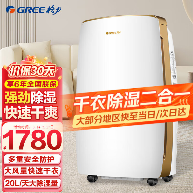 格力(GREE)家用除湿机智能除湿器40升日除湿量客厅卧室防潮干衣机商家两用抽湿机 20L/天 20-40㎡ DH20EH价格:1780.00元!