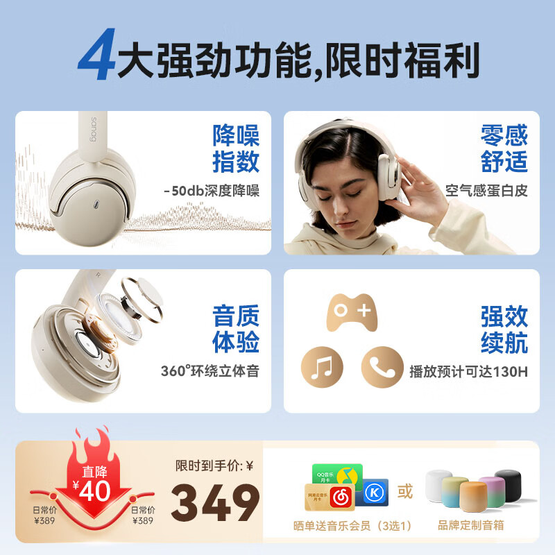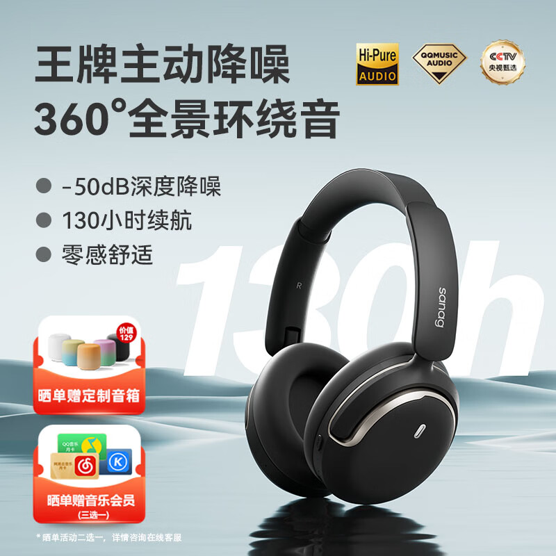 SANAG塞那【央视甄选 | QQ音乐认证】D50头戴式蓝牙耳机 -50db主动降噪超长续航音乐耳机包耳式游戏耳机价格:389.00元!