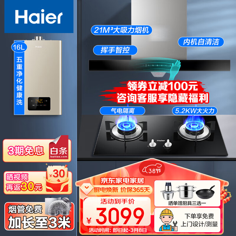 海尔(Haier)抽油烟机燃气灶套装21m3一级能效欧式顶吸ET912+5.2KW灶Q2BE50+16升热水器16K3BD厨房三件套[家电]价格:3199.00元!