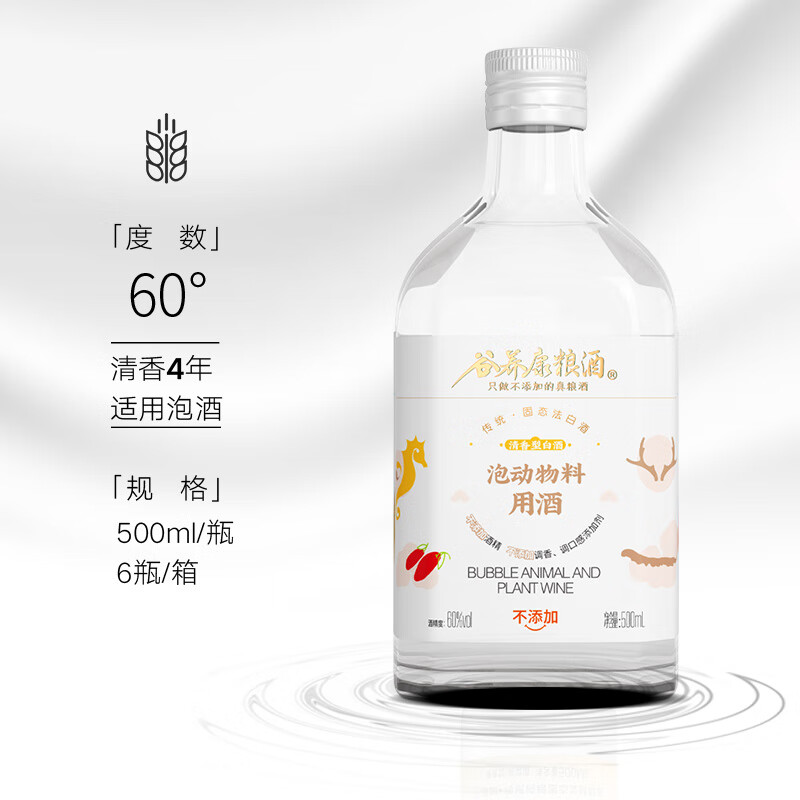 谷养康粮食酒泡酒用酒瓶装清香高粱酒白酒泡果酒泡动植物料酒真粮酒 60度 500mL 6瓶 【适合动植物类】价格:261.00元!
