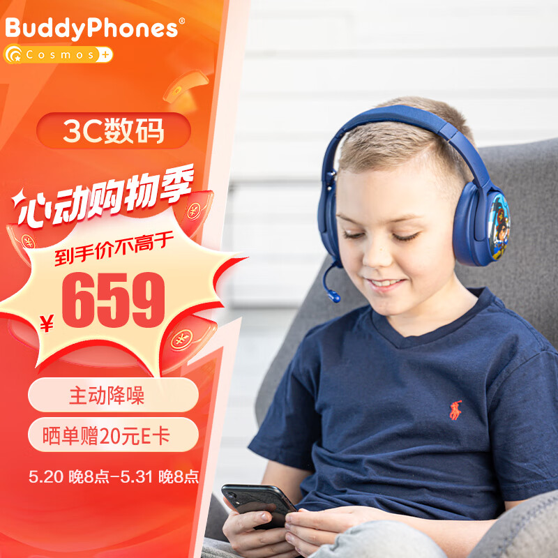 onanoff BuddyPhones儿童耳机头戴式主动降噪 大耳包蓝牙无线网课学习学生耳机 持久续航 Cosmos+海军蓝价格:799.00元!