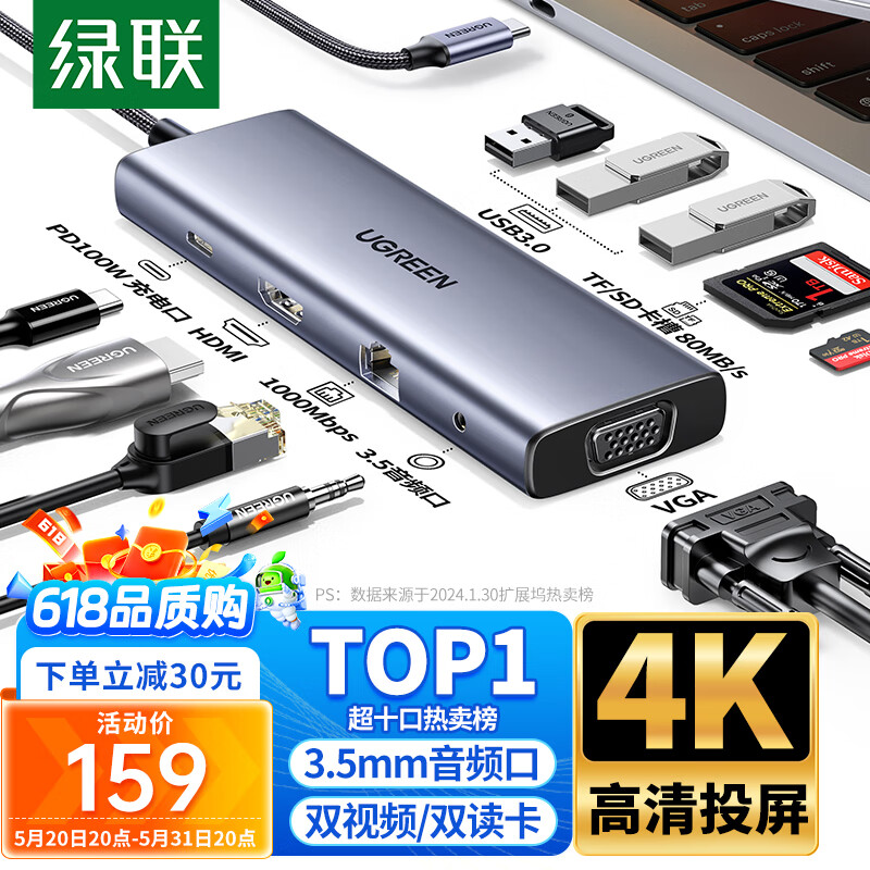绿联Type-C扩展坞雷电4拓展坞USB-C分线器HDMI网线转接头HUB音频读卡通用苹果15MacBook电脑华为笔记本价格:159.00元!