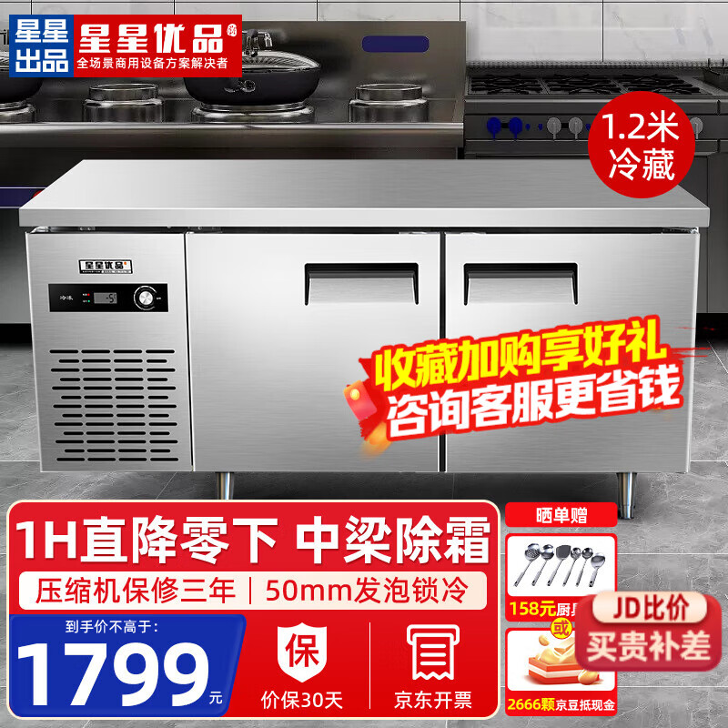 星星优品(XINGX·YOUPIN)操作台冰柜冷藏工作台商用冷冻不锈钢平冷厨房卧式冰箱 水吧台冰柜奶茶店设备 1.2*0.8*0.8 冷冻(经济升级款)价格:1799.00元!