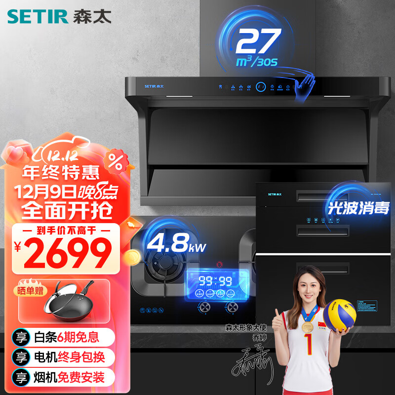 森太(SETIR)吸油烟机灶具套装 顶侧双吸抽油烟机鸳鸯定时燃气灶消毒柜厨房三件套 B833+TM81+F260(液化气)价格:2999.00元!