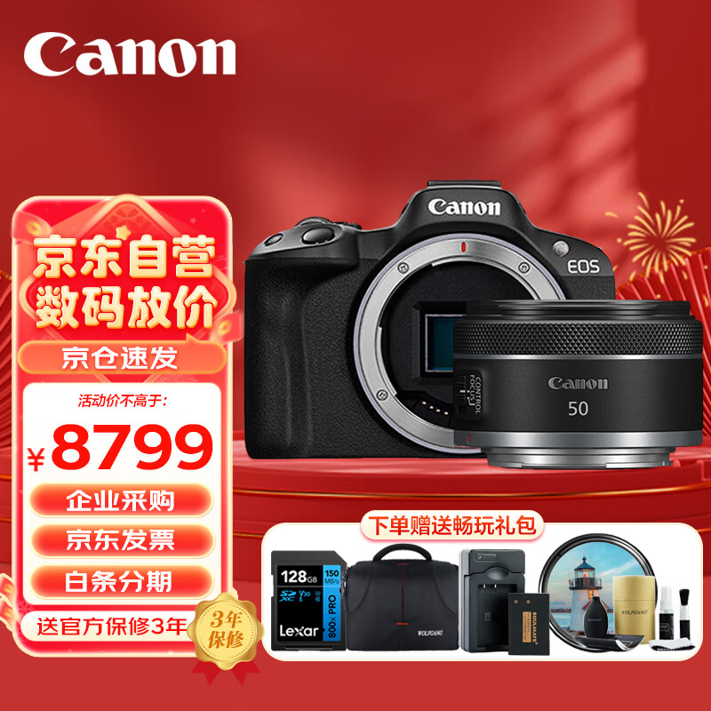 佳能(Canon)EOS R50 微单相机 4K Vlog视频 家用旅游美颜照相机 RF 50mm F1.8小痰盂人像定焦 黑 旅行畅玩套装价格:8799.00元!