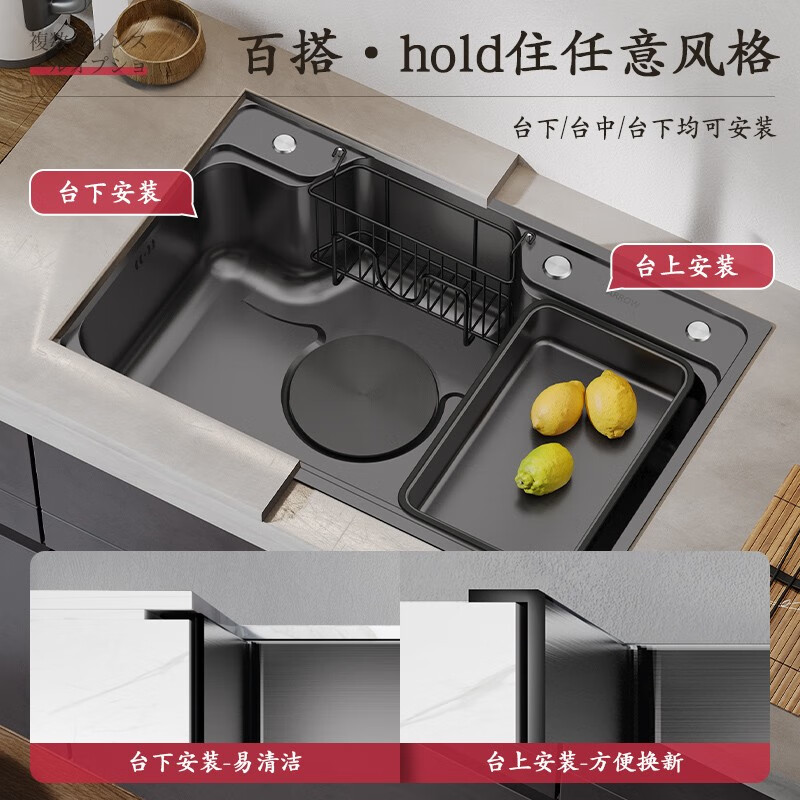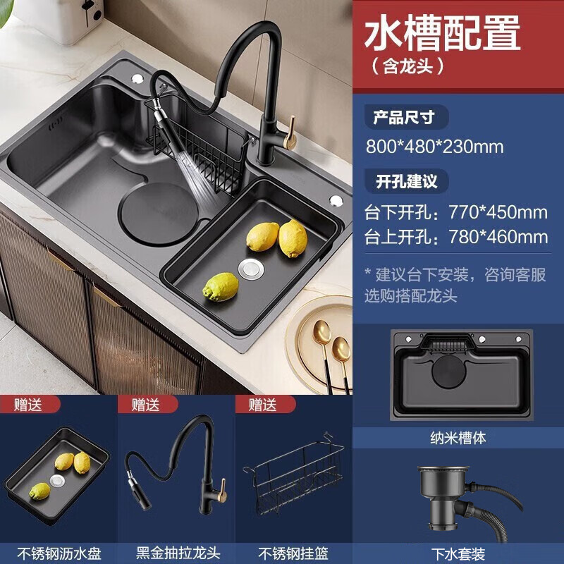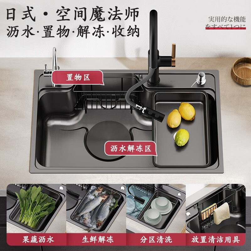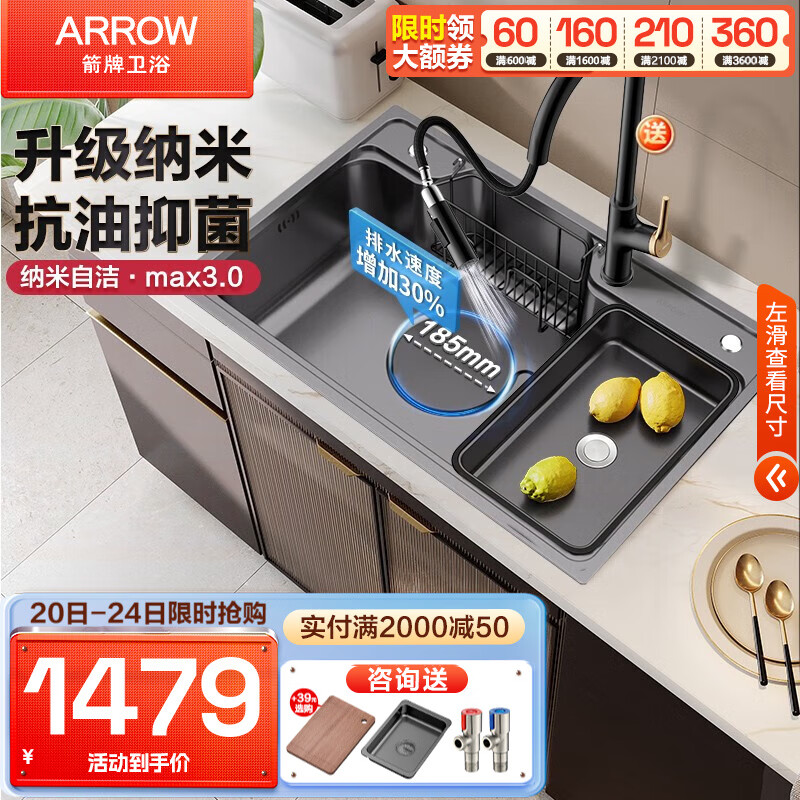 箭牌(ARROW)304不锈钢日式水槽大单槽洗菜盆纳米台上台中台下洗碗池 80*48纳米单槽-冷热黑金抽拉龙头价格:1889.00元!