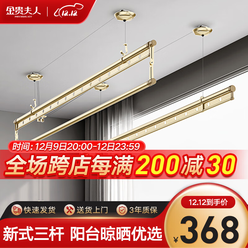 金贵夫人三杆升降晾衣架室内手摇晾衣杆阳台晒衣架晒被子 2.7米+10个衣架价格:428.00元!