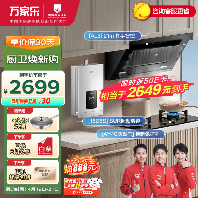 万家乐 抽油烟机 烟灶热套装 21立方自清洗烟灶套装 16L水量伺服器 热水器三件套装AL3+AY4C+16D6S天然气价格:2799.00元!