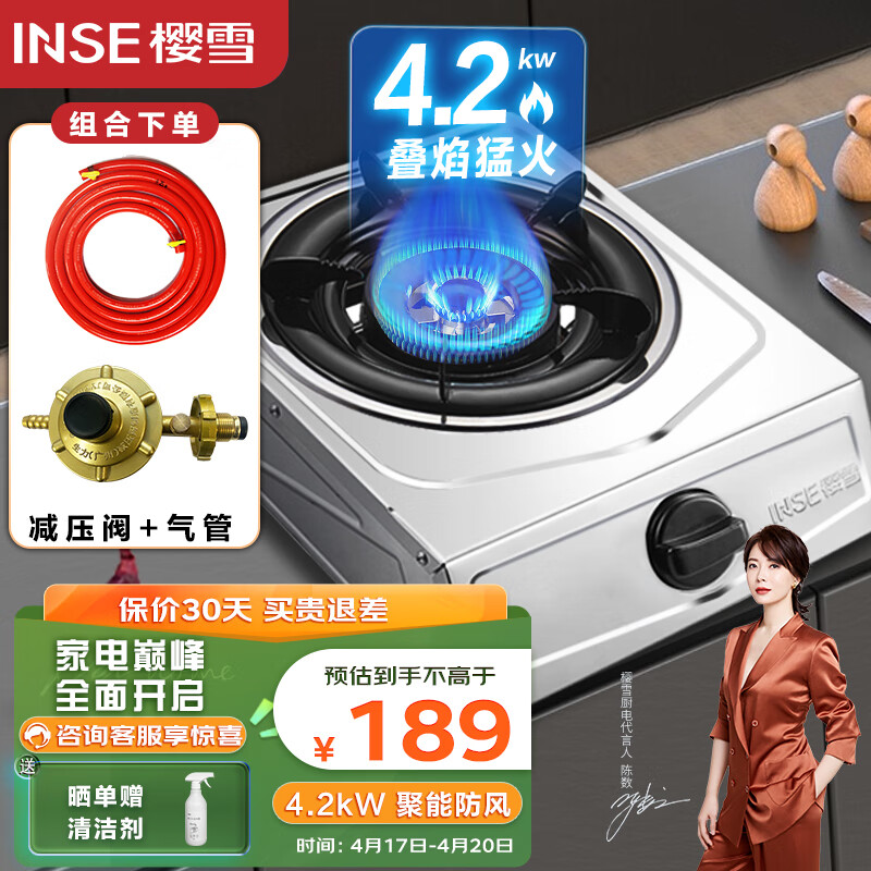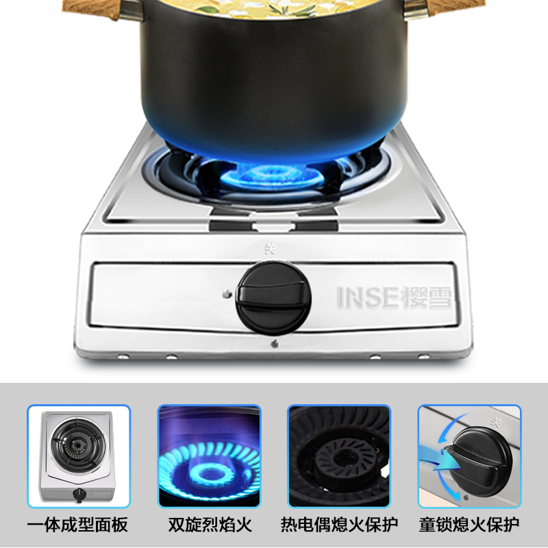樱雪(INSE)燃气灶单灶 台式4.2kW火力煤气灶单灶 节能单眼灶 JZY-T1501(G)W液化气+减压阀+软管价格:189.00元!