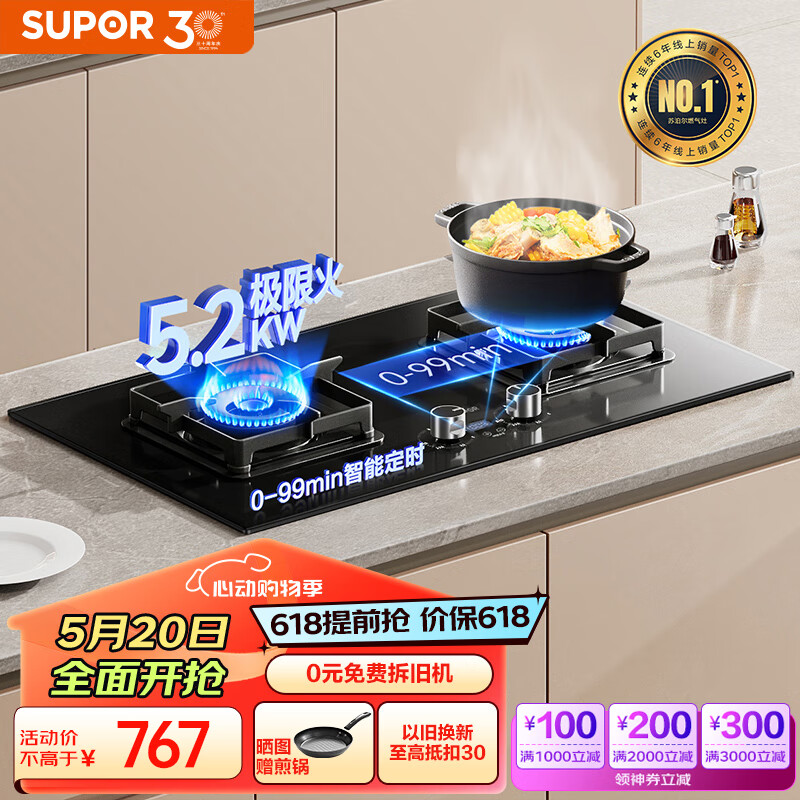 苏泊尔(SUPOR)燃气灶双灶家用 液化气双灶具5.2kW猛火大火力 嵌入式台式两用灶台 智能定时 全进风DB2Z7S液价格:797.00元!