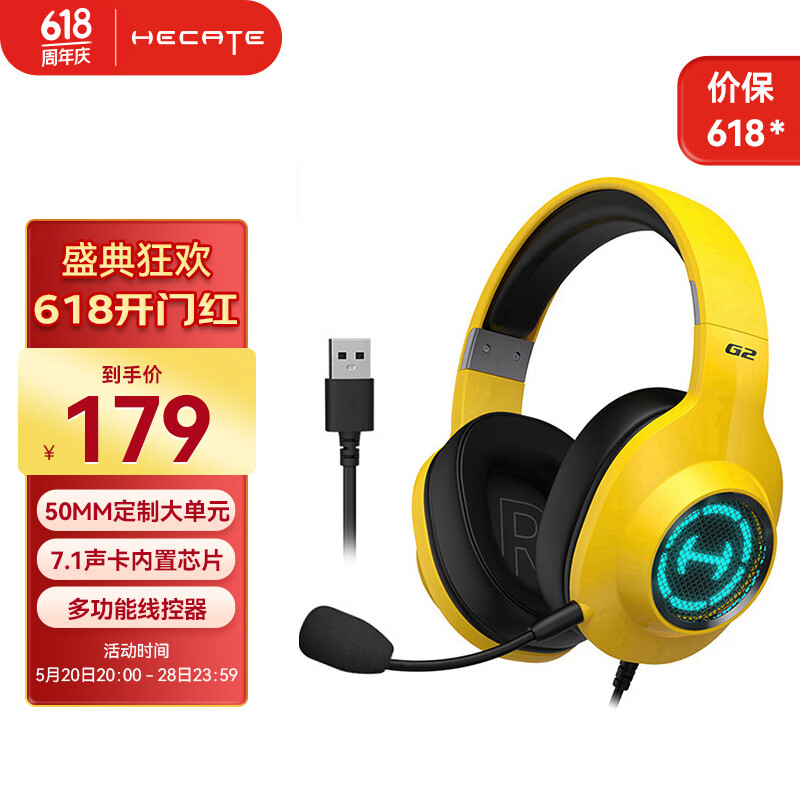 漫步者(EDIFIER)HECATE G2专业版 USB7.1声道 游戏耳机电竞耳麦头戴式电脑耳机麦克风吃鸡耳机带线控 兰博黄价格:199.00元!